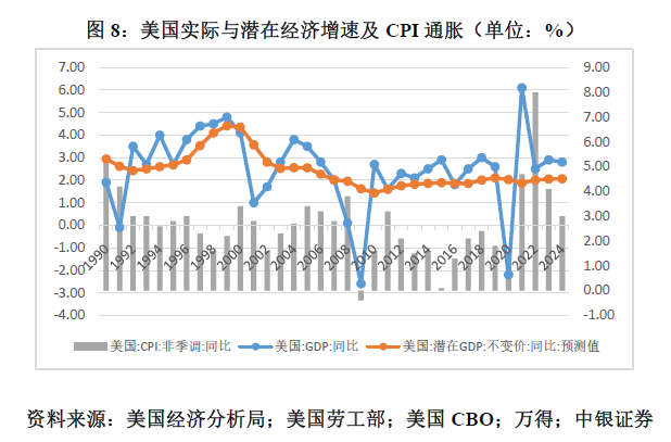 2022年11月30日,鲍威尔在布鲁金斯学会发表演讲时表示,低于趋势水平的增长可能是降低通胀的必要条件。这一过程可能会包括一个增长较低、劳动力市场疲软的时期。实际情况是,到2024年三季度,美国实际国内生产总值(GDP)环比折年率增长2.8%。美联储9月份更新利率点阵图到年底降息三次时,预测美国经济全年仅增长2.0%。而据国际货币基金组织(IMF)最新预测,美国经济将在上年增长2.9%的基础上再扩张2.8%,远高于美联储和国会预算办公室(CBO)估算的美国1.8%~2.0%的潜在增速。IMF还预测,2025年美国实际GDP增长2.2%,继续高于而非低于趋势值。