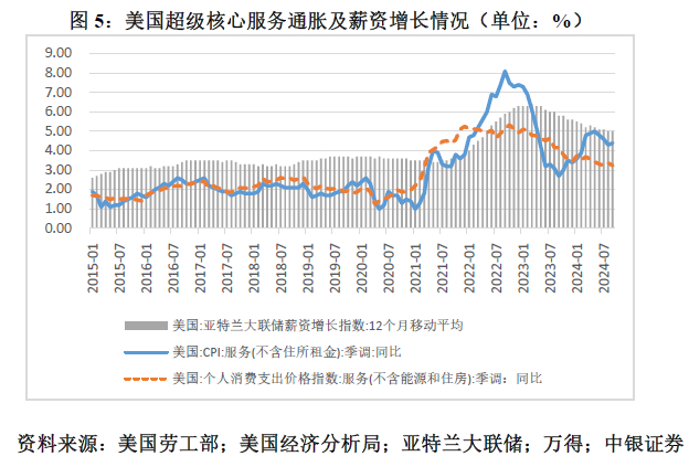 最新统计数据显示,2024年9月份,美国不含能源和住房的PCE超级核心服务通胀为3.2%,较2022年10月的高点5.3%回落,但仍相当于2015~2019年趋势值的1.58倍;不含住所租金的CPI超级核心服务通胀为4.4%,较2022年9月的高点8.1%明显回落,但较2023年9月的前低2.7%有所反弹,且相当于疫情前五年趋势值的2.26倍。同期,12个月移动平均的亚特兰大联储薪资增速为5.0%,较2023年3月的高点6.4%回落,但仍高于同期PCE和CPI超级核心服务通胀不少,且相当于疫情前五年趋势值的1.51倍(见图5)。