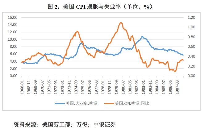 1971年8月,尼克松总统实施新经济政策,让美元与黄金脱钩,并承诺将通胀控制在2%~3%。但因通胀失控,尼克松不得不实施工资和价格管控。到1974年8月尼克松因水门事件下台时,CPI通胀高达10.9%,较他1969年1月入主白宫时高出6.5个百分点,失业率由3.4%升至5.5%(见图2)。