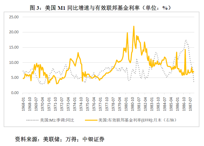 彼时,美联储货币调控以数量型目标——狭义货币供应量(M1)为主。1970年2月至1971年7月(尼克松新政前夕),美国M1同比增速由2.9%升至7.5%,有效联邦基金利率由8.5%降至5.5%(低至1970年12月的3.0%)。尽管尼克松新政承诺的通胀目标一直未能兑现,但1971年8月至1974年8月(尼克松被弹劾下台),M1增速平均为6.7%,CPI通胀平均为5.9%,且自1974年2月起达到两位数(持续到1975年4月)(见图3和图2)。
