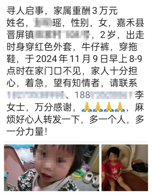 发现瑶瑶失踪后,李女士立即报警,当地警方和村民都积极帮忙搜寻,并且发布了寻人启事: