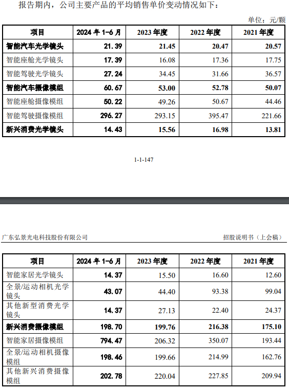 此外,因单价较低产品销售占比提高,弘景光电旗下智能家居光学镜头2022年以来平均销售单价呈逐年下降,每颗从16.6元、15.5元跌至2024年上半年的14.37元。鉴于同样的原因,该公司全景/运动相机光学镜头2021年以来的平均销售单价呈下降趋势,每颗从99.04元、93.38元、44.4元直线下滑至43.07元;公司的全景/运动相机摄像模组单价从2021年162.76元/颗涨至214.99元/颗,但该产品单价在2023年、2024年上半年因芯片、陀螺仪等原材料价格下降而下调至199.66元/颗、198.46元/颗。