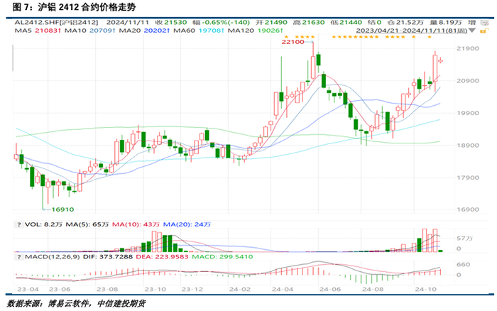 本周沪铝12合约震荡偏强,价格重心大幅上移。周一电解铝社会库存小幅去化,在消费逐步转淡的背景下,下游接货力度一般,铝价小幅回调。周中主流消费地到货依然偏低,现货成交略有改善。氧化铝现货价格持续走高,少量铝厂选择停产检修,成本支撑较为明显,沪铝跟随氧化铝期货上涨,价格突破21000压力位。临近周末,特朗普交易升温,美元大幅走强,有色普遍承压,沪铝小幅回落。目前沪铝12合约报收21530元/吨,周涨幅4.35%。
