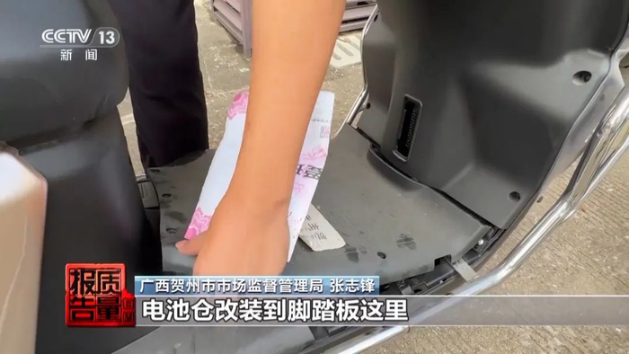 广西贺州市市场监督管理局 张志锋:实际这辆车的电池舱在这里,但没有安装电池,因为电池舱只能装四块。他为了多装电池,电池舱改装到脚踏板这里,就能多装电池了,装了六块。