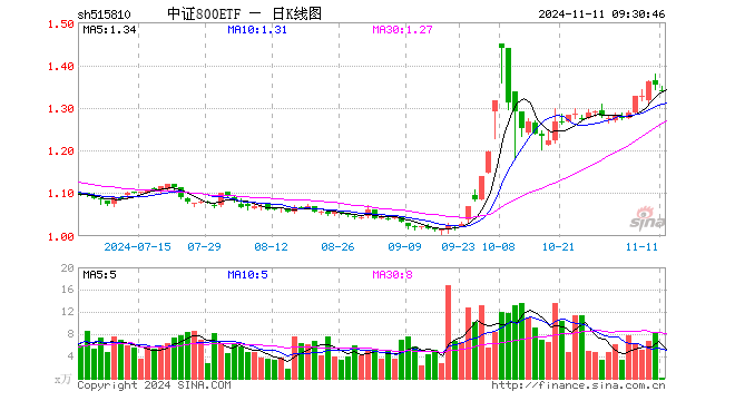 11月11日,中证800ETF(515810)开盘跌0.81%,报1.341元。中证800ETF(515810)重仓股方面,贵州茅台开盘跌1.24%,宁德时代跌2.00%,中国平安跌1.67%,招商银行跌1.29%,美的集团跌1.86%,长江电力跌0.58%,五粮液跌1.99%,紫金矿业跌1.70%,兴业银行跌1.07%,比亚迪跌0.97%。