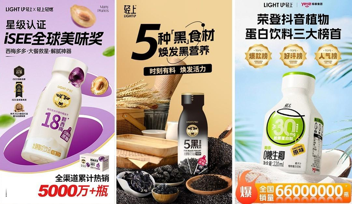 而轻上从成立开始,其系列产品在强调产品功效价值感的同时,也把口感作为产品开发的关键方向之一。从开局的0糖生椰,清甜的椰汁口感,加上零糖分的健康标准,押中年轻人日益增加的健康焦虑;到大单品“快畅畅西梅多多”,巧妙融合了西梅与酸奶,直击年轻人肠胃管理和身材管理的大需求,一经上市便霸榜抖音电商等多个平台的酸奶类目销量TOP;再到借势养生食补以“养生食补+美容成分+酸奶饮品”的三重营养概念所打造的五黑营养酸奶……