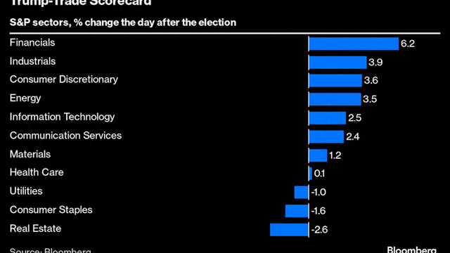作为背景,特朗普在竞选的过程中做出了许多承诺:高关税、减税、对商业友好的放松管制和全面驱逐移民等等。对于上周因猜测特朗普的政策将提振经济而涌入股市的投资者来说,挑战在于弄清楚哪些行业将得到持久的提振。