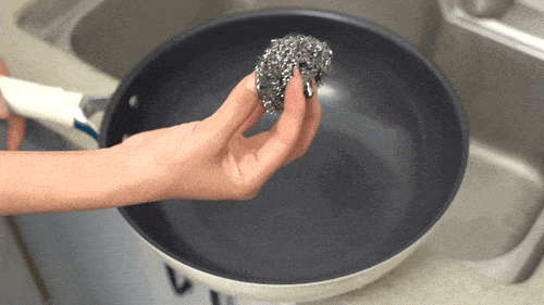 清洁不粘锅时,由于没有任何烹饪后的糊锅、粘锅,只需简单用水冲洗即可将不粘锅清洁干净,非常省事。然而为了验证钛景瓷的坚固、耐用,我们还是用钢丝球对锅底用力来回刮擦,测试动图是以4倍速播放,可以看到,长时间的钢丝球刮擦,是没有对锅底造成任何划伤,验证了钛景瓷的可靠。