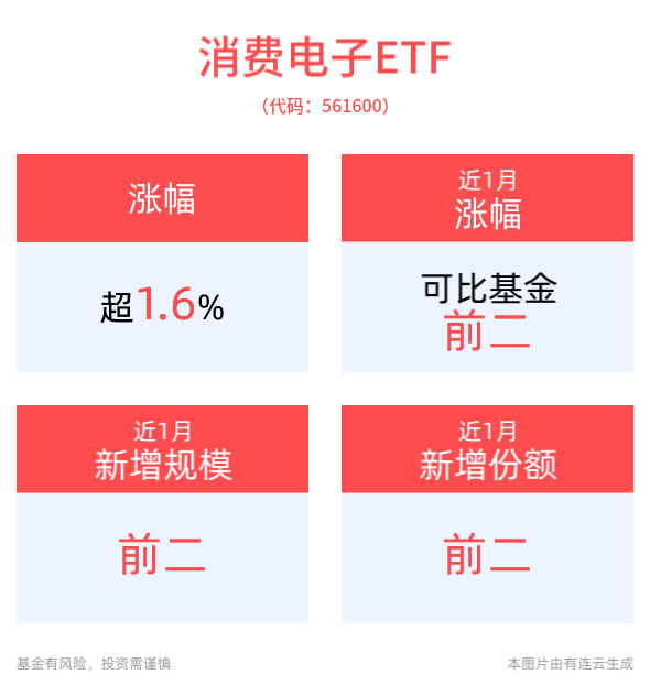 规模方面,消费电子ETF近1月规模增长2069.32万元,实现显著增长,新增规模位居可比基金2/7。份额方面,消费电子ETF近1月份额增长400.00万份,实现显著增长,新增份额位居可比基金2/7。