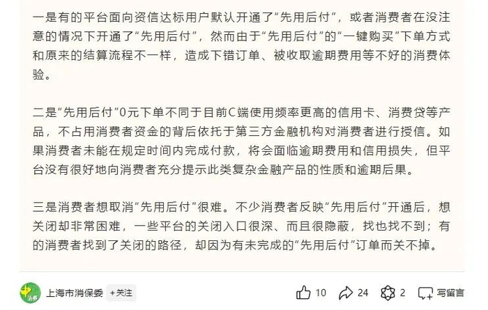 1.平台应该让消费者自主选择是否开通“先用后付”;