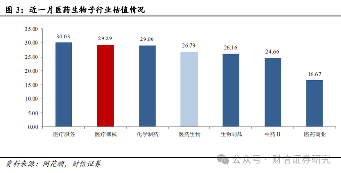 行情回顾:上月医药生物(申万)板块涨跌幅为-0.22%,在申万31个一级行业中排名第29位,医疗器械(申万)板块涨跌幅为-1.62%,在6个申万医药二级子行业中排名第3位,分别跑输医药生物(申万)、沪深300指数1.411.56个百分点。截至2024111日,医疗器械板块PE均值为29.29倍,在医药生物6个二级行业中排名第2位,相对申万医药生物行业的平均估值溢价9.34%,相较于沪深300、全部A股溢价166.68%108.80%