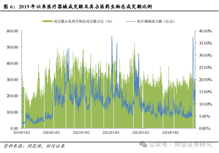 截至2024111日,医疗器械板块PETTM,整体法,剔除负值,下同)均值为29.29倍,在医药生物6个二级行业中排名第2位,申万医药生物板块PE26.79倍;医疗器械板块相对申万医药生物行业的平均估值溢价9.34%,相较于沪深300、全部A股溢价166.68%108.80%