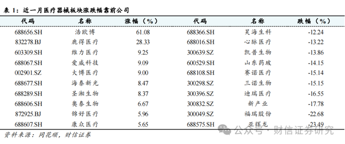 近一月板块内标的普涨,涨跌幅排名靠前的个股有浩欧博61.08%)、鹿得医疗(28.33%)、维力医疗(9.25%)、爱威科技(9.09%)、大博医疗(9.00%);涨跌幅排名靠后的个股有亚辉龙-23.49%)、福瑞股份(-22.68%)、新产业(-17.78%)、迪瑞医疗(-16.55%)、三诺生物(-15.15%)。