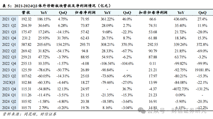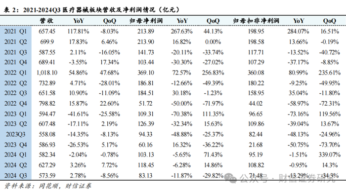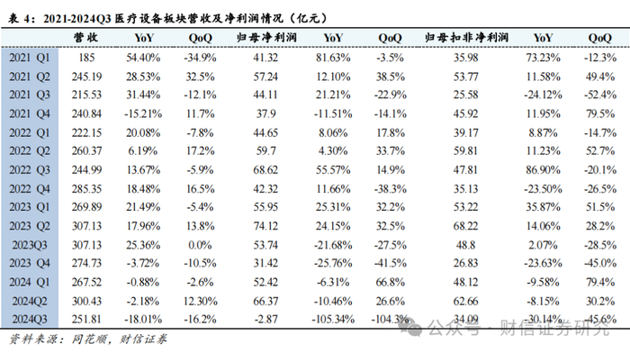 医疗设备:受到2023年行业高基数、行业监管政策变化影响,2024年医疗设备招标入院较为缓慢,2024Q1-Q3医疗设备板块实现营收819.76亿元(-2.11%),归母净利润155.92亿元(-14.87%); 2024Q3实现营收251.81亿元(YoY-18.01%QoQ-16.18%),归母净利润-2.87亿元(YoY-105.34%QoQ-104.32%),扣非归母净利润34.09亿元(YoY-30.14%QoQ-45.60%)。