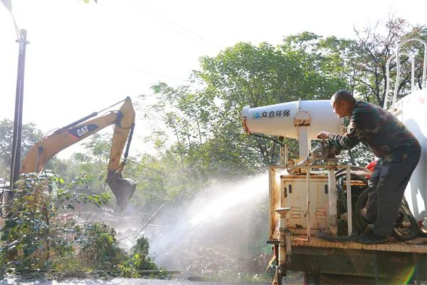 “今天的拆迁任务是5600平方米,我们按照拆迁规定的安全文明施工标准,稳步推进。现在现场三台挖机、四台水车在三个区域同步进行作业,预计今天一天之内全部拆完。”施工现场负责人钱勇介绍道。
