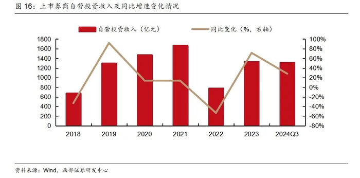 2024Q3 权益市场快速反弹,2024Q1-Q3券商自营投资收入同比提升。2024Q3万得全A指数上涨17.7%,前三季度上涨8.2%%。债券市场整体表现平稳, 2024Q3中证综合债指数上涨 1.1%。上半年债市走强叠加24Q3权益市场反弹推动投资收益同比正增。2024Q1-Q3,上市券商合计自营投资收益1316.89亿元,同比+28%。