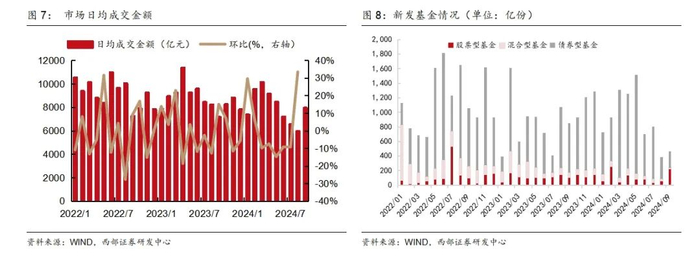 市场交投活跃度同比下行叠加新发基金表现疲软,经纪业务手续费收入有所收缩。我们统计范围内的43家上市券商24Q1-Q3实现经纪业务净收入664.39亿元,同比-13.6%;市场交投活跃度不振叠加新发基金承压拖累经纪业务收入表现。2024年前三季度,全市场股基成交额同比-10%,新发基金规模(股票型+混合型,按照“认购起始日”统计)合计为1487亿份,同比下降33%。