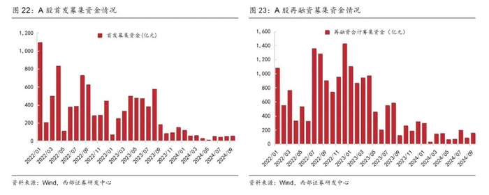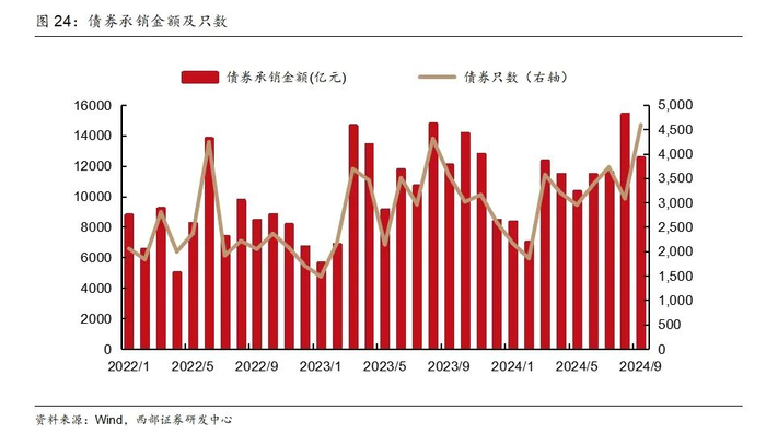 股权融资规模同比收缩显著,债券承销规模小幅提升。监管强调统筹一二级市场平衡,股权融资规模同比回落。截至24Q3全市场IPO承销规模481亿元,同比-85%;再融资规模1184亿元,同比-80%。截至24Q3,全市场债券承销规模同比+1.5%至10.06万亿元,一定程度上缓解了股权融资收紧的影响。