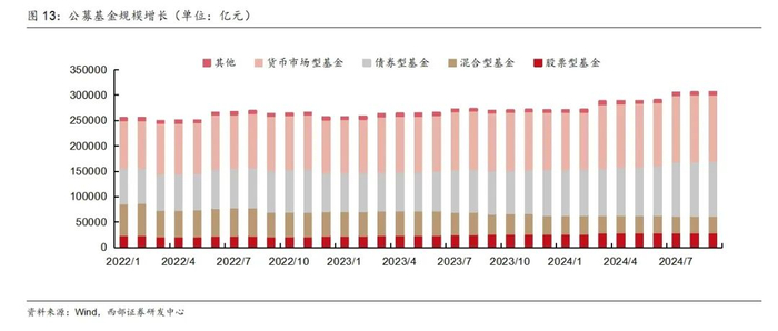 券商资管规模企稳,行业收入小幅下滑。从规模上看,截至2024H1,券商资管总规模为6.42万亿元,同比+2.64%,规模企稳。截至24Q3,据wind数据,公募基金合计净值30.72万亿元,同比+13.7%。受公募费改影响,预计公募基金收入同比下降。2024 年前三季度,我们统计范围内的43家上市券商资管业务净收入同比-2.46%至 338.77 亿元。