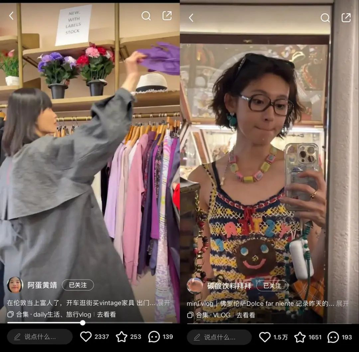 博主@阿蛋黄靖就是一位居住在海外拼事业的模特,在她的vlog中经常会有去线下古着店淘货的内容,分享的穿搭中也多有古着。时尚博主@碳酸饮料经常分享vintage穿搭,以及常逛的店铺。