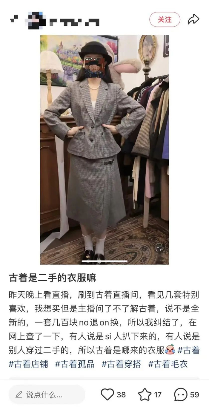 但经由社交平台的发酵、消费破圈后,古着的概念泛化到了“二手产品”。这也就给很多商家带来了可趁之机,很多直播间所谓的古着,大多其实是来路不明的旧产品、尾货,甚至一度被很多人诟病为“洋垃圾”。社交平台上也有很多新手咨询,"什么是古着?"、"帮忙鉴定古着"、"古着是二手衣服吗?"、“上千买到的Dior外套好像是假的”。