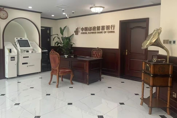 在邮储银行天津民园支行内,不少游客慕名前来、流连忘返。复古中式壁灯、老式转盘电话,以及缓缓旋转的黑胶唱片机,无一不诉说着过往的故事。金融服务体验区、VIP客户体验室及“复古风”休闲区,让客户体验急速穿越。