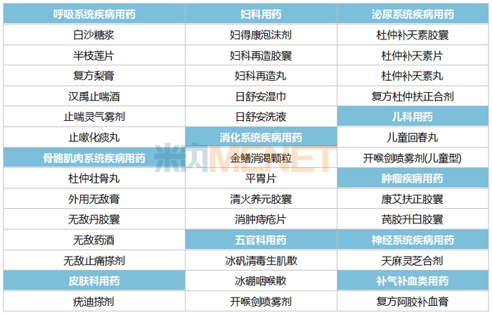 34个独家中成药涉及11个大类,呼吸系统疾病用药占了6个,骨骼肌肉系统疾病用药、妇科用药各占了5个,消化系统疾病用药、泌尿系统疾病用药各占了4个,五官科用药占了3个,肿瘤疾病用药、儿科用药各占了2个,其余大类各占1个。