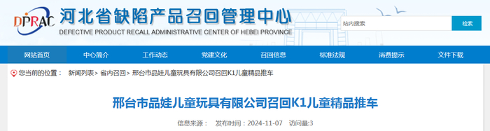 中国质量新闻网讯 据河北省缺陷产品召回管理中心网站消息,日前,邢台市品娃儿童玩具有限公司按照《消费品召回管理暂行规定》的要求,主动向河北省市场监督管理局报告了召回计划,将自即日起,召回2024年5月3日生产的儿童精品推车,型号K1,涉及数量为150件。