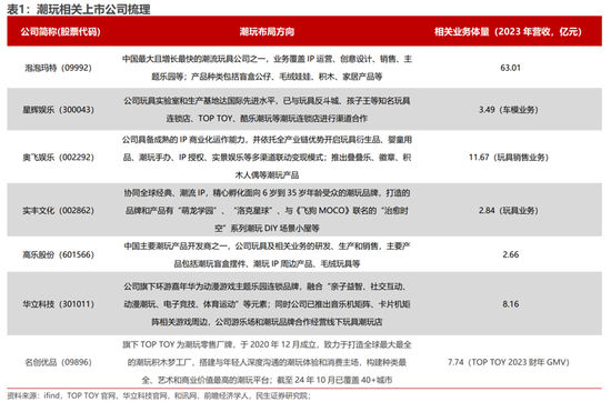 需求催化下,企业纷纷入局。企查查数据显示,截至2023年,国内相关潮玩企业的存量为12189家,远超前三年的存量。越来越多的企业争相涌入,2020年至2023年,国内潮玩相关企业的数量逐渐上涨,2024年新增超6000家,而2020年新增数量为600多家。上市公司中,除了泡泡玛特、TOP TOY(名创优品旗下)这类以潮玩为核心业务的企业,还有多家老牌玩具、传媒企业纷纷加入潮玩赛道。