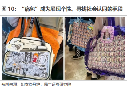 二是“痛文化”兴起,来展示自己的“谷圈属性”。痛包(itabag)起源于日本ACG(ACG是动画、漫画、电子游戏的英文Anime、Comics、Games的首字母缩写),是指挂满二次元周边装饰的包包,因为这样的包看上去十分夸张,且视觉冲击感强烈,让人看了就觉得“痛”。常见的痛包最外侧会有一个由聚氯乙烯(pvc)材料制作的透明夹层,人们通常会将收集来的吧唧,也就是二次元人物的周边徽章整齐排布在夹层里,用来装饰自己的痛包。当然,除了吧唧,人们还会用各种方式装饰包包,比如棉花娃娃、手办、玩偶等,以表达自己的个性爱好。这种特殊且极具个性的表达形式,让痛包迅速形成了一种文化并且在社媒平台上广泛传播。