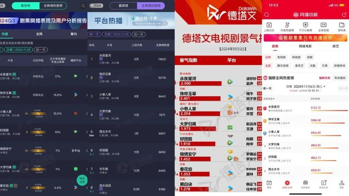 与之呼应,在最新公布的德塔文电视剧景气指数日榜、云合剧集霸屏日榜与全网舆情热度日榜、以及猫眼剧集全网热度日榜上,《永夜星河》《珠帘玉幕》皆分别稳坐冠、亚军宝座,《小巷人家》屈居季军。