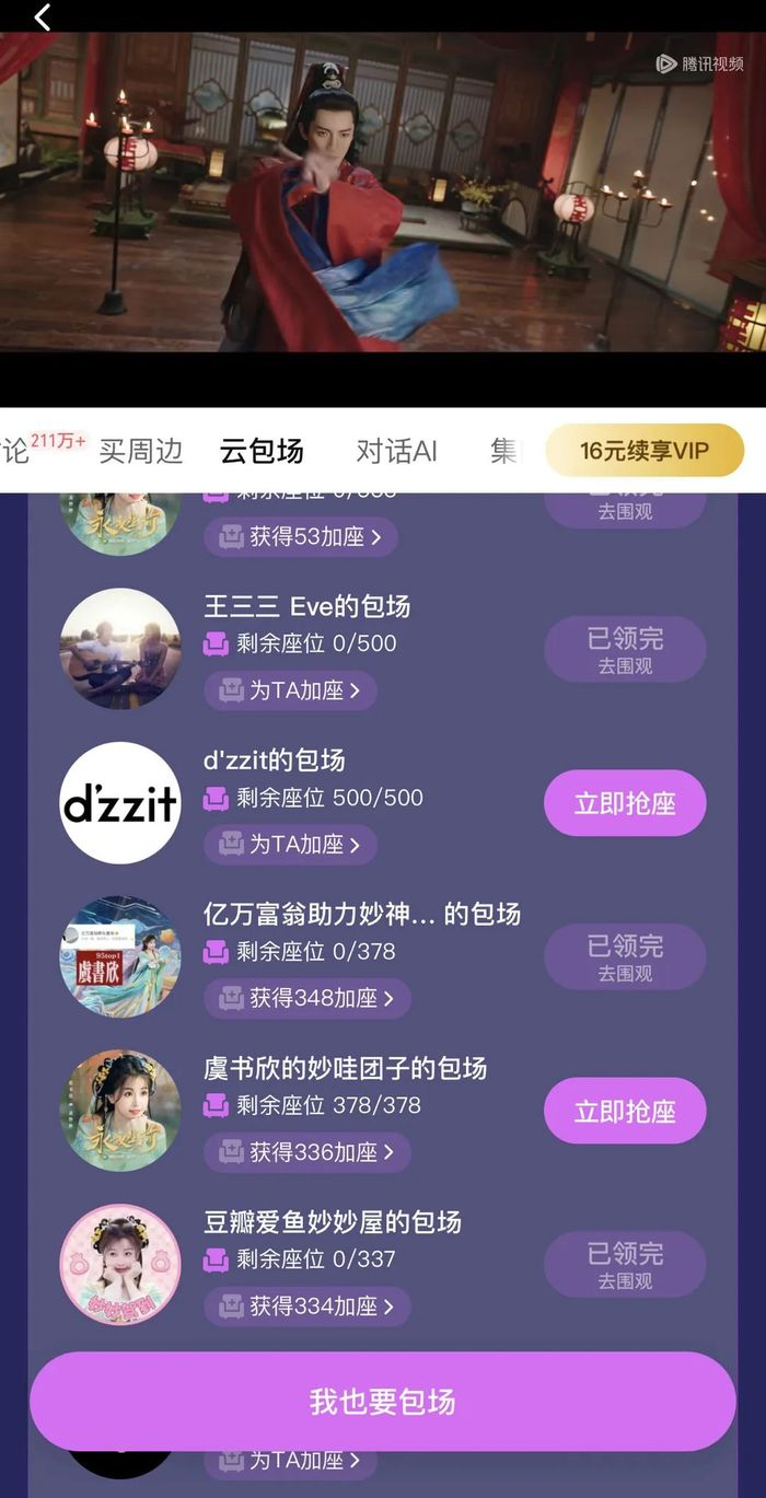 另一个需要注意的数据是,《永夜星河》开播仅4天腾讯视频云包场数量就达到了69000,位列平台年度TOP3。而这不仅是平台们的增收新姿势,也是一个能够为剧集热度锦上添花的营销新途径。