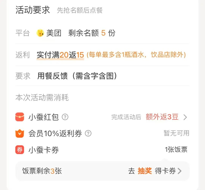 以小蚕为例,用户需要先在小蚕中挑选自己的心仪餐馆,然后通过 “ 饭票 ” 抢到返现名额。之后再跳转到美团或饿了么,在同一家店铺下单并实付到要求的金额( 比如满 30 返 15 要实付 30 元 ),用餐之后需要在规定时间内在美团或饿了么写好评价并截图订单,返回小蚕上传用餐凭证,然后便可以在账户中收到与返现额等额的 “ 蚕豆 ”。