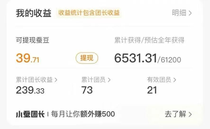 “ 之前点过一些韩式拌饭、蟹黄拌饭之类的,基本上是难以下咽,但是为了返现还是要硬着头皮给好评。” 小影对知危说道。最近一年半,他都是从一个叫 “ 小蚕 ” 的平台上下单外卖,同样是美团、饿了么的订单,通过小蚕可以给到大额返现。在他的账户后台上,显示这一年半他 “ 累计获得 6531.31 ” 个 “ 蚕豆 ”( 蚕豆可以等额提现为人民币 )。