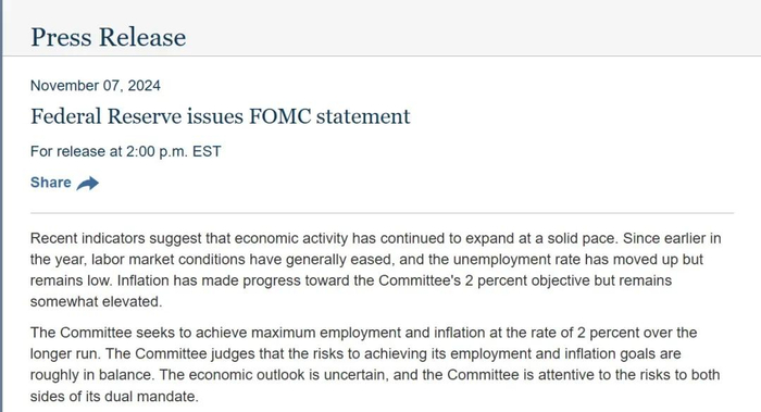 当地时间11月7日,美国联邦储备委员会宣布,将联邦基金利率目标区间下调25个基点,降至4.5%至4.75%之间的水平。