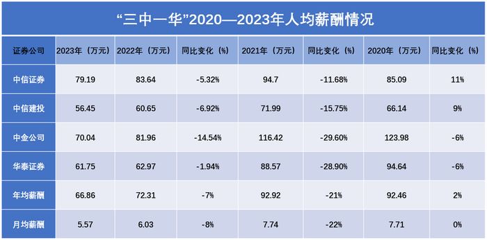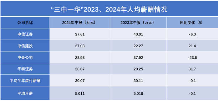 从手中流动的数额没变,进入口袋的工资却开始缩水。以因高薪闻名的头部券商为例,Wind数据显示,截至2024年6月30日,4家国内头部证券公司“三中一华”(中信证券中信建投中金公司华泰证券)的员工共71017人,人均半年应付薪酬预估30.07万元。也就是说,在包含了去年年终奖金的情况下,“三中一华”今年上半年每月人均薪酬约5万元。