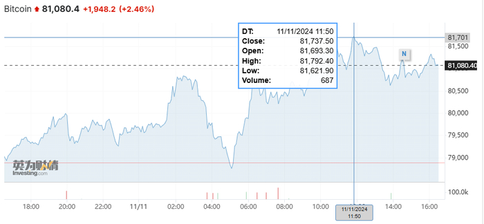11月11日午间,比特币价格冲破8.1万美元/枚,最高81792美元/枚。截至11月11日16时30分,比特币价格有所回落,报81080美元/枚,日内涨幅达2.46%。