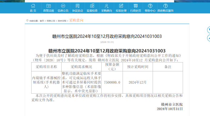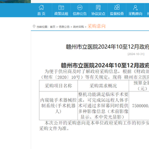 近日,江西政府采购网披露了一则重要信息:赣州市立医院计划采购内窥镜手术器械控制系统,即通常所说的腹腔镜手术机器人,其预算价格设定为750万元。从目前腹腔镜手术机器人的需求及竞争情况来看,大概率为四臂腔镜手术机器人。此举标志着在公开市场上,四臂腔镜手术机器人的价格首次跌破800万元大关,同时也刷新了近一年来同类设备采购意向的预算最低纪录。