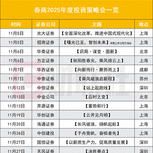 未来两个月,将有超过15家券商策略会举行。就近期而言,本周将有3家券商举办年度策略会,11月12日,中信证券举行2025年资本市场年会;11月13日,中金公司举行的年度投资策略会以及开源证券2025年度投资策略会。