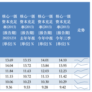 具体来看,三季度末建设银行、工商银行核心一级资本充足率分别为14.10%、13.95%,分别较年初提升0.95个百分点、0.23个百分点,其中三季度提升0.09个百分点、0.11个百分点;中国银行、农业银行相关指标分别为12.23%、11.42%,较年初提升0.6个百分点、0.7个百分点,其中三季度环比提升0.2个百分点、0.29个百分点;交通银行期末核心一级资本充足率为10.29%,相比年初提升0.06个百分点,但较上半年略降0.01个百分点;邮储银行最新指标为9.42%,较年初下降0.11个百分点,三季度则回升0.14个百分点。