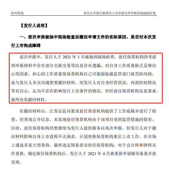 “前任保荐机构(即东吴证券)因考虑到申报材料中存在部分关联交易等信息存在遗漏、对自身工作质量缺乏足够信心等因素,担心因工作质量使保荐机构自己可能面临被监管部门处罚的风险。故与发行人多次沟通想要撤回材料。”恒兴科技表示。