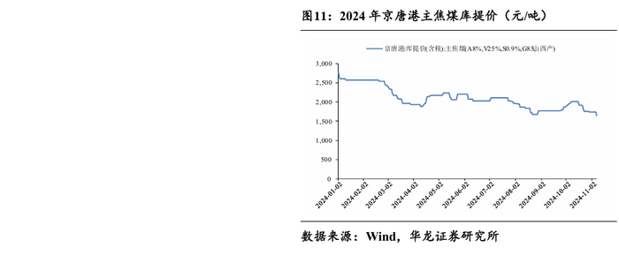 2024Q3煤炭行业运行总体平稳,煤炭价格先降后升,秦皇岛港5500大卡动力煤平仓均价约848.09元/吨,同比下降约2.09%;京唐港主焦煤库提价为1,893.79元/吨,同比下降约10.98%。