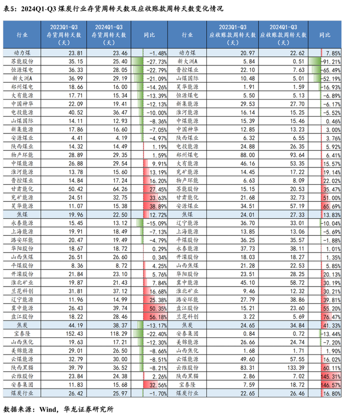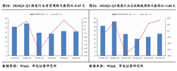 2024Q1-Q3运营效率整体有所下降。煤炭行业上市公司存货周转天数25.97天,同比-0.45天,共有18家公司平均存货周转天数下降,同比降幅排名前5的有:苏能股份、恒源煤电、宝泰隆、新大洲A、永泰能源;煤炭行业上市公司平均应收账款周转天数26.46天,同比+3.80天,共有12家公司应收账款周转天数下降,同比降幅排名前5的有:新大洲A、晋控煤业、山煤国际、昊华能源、安泰集团。