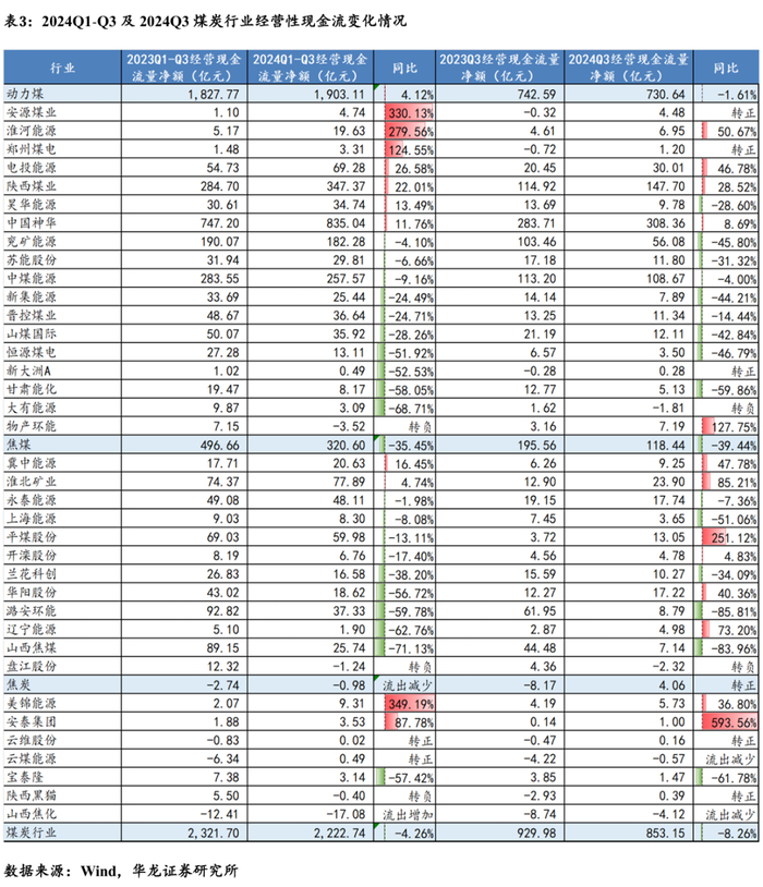 行业子板块现金流分化明显。动力煤/焦煤/焦炭板块,2024Q1-Q3分别实现经营现金流量净额1903.11/320.60/-0.98亿元,同比+4.12%/-35.45%/流出减少。