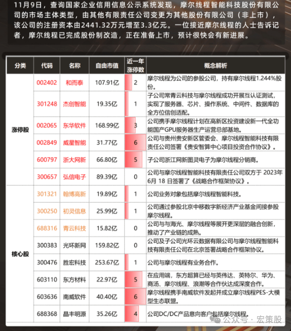 一、11月9日,查询国家企业信用信息公示系统发现,摩尔线程智能科技股份有限公司的市场主体类型,由其他有限责任公司变更为其他股份有限公司(非上市),该公司的注册资本由2441.32万元增至3.3亿元。一位接近摩尔线程的人士告诉记者,摩尔线程已完成股份制改造,正在准备上市,预计很快会有新进展。