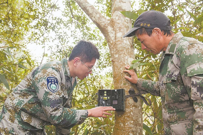 君子峰国家级自然保护区工作人员布设红外相机监测野生动物。