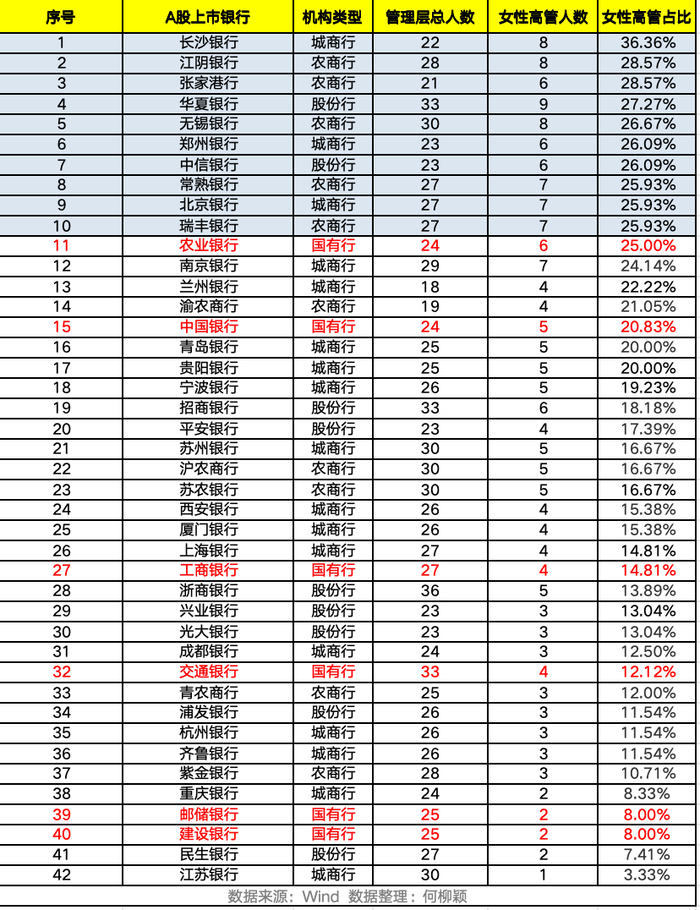 涉及正副行长以及行长助理职务的仅29人,其中副行长职务比例明显更高,42家上市银行中,女性行长仅2人,分别是无锡银行行长陈红梅以及长沙银行行长张曼。