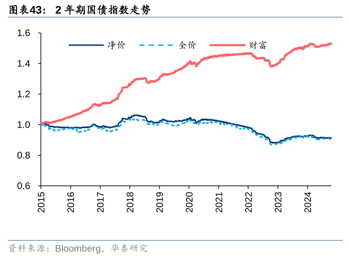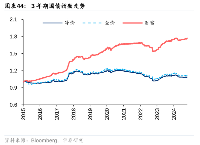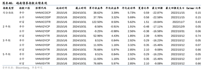 自2015起,河内交易所正式推出了政府债券系列指数,包括综合指数和按剩余到期日划分的不同久期指数,即2年期、3年期和5年期政府债券指数,每个指数包括净价、全价和财富三种口径,其中,净价指数不考虑债券的应计利息,通常用来衡量债券市场的价格涨跌情况;全价指数将债券的应计利息包含在内,在付息日会出现跳跃,不连续,实际投资中使用较少;财富指数不仅包括了应计利息,还考虑了利息的再投资收益,通常用来作为投资业绩的比较基准或业绩评价标准。越南债券综合财富指数2015年以来年化收益8.5%,年化波动率5.62%,夏普比率1.51,长期业绩表现较好。