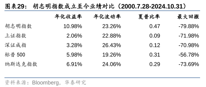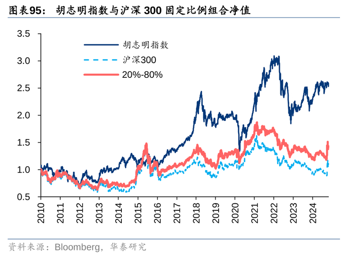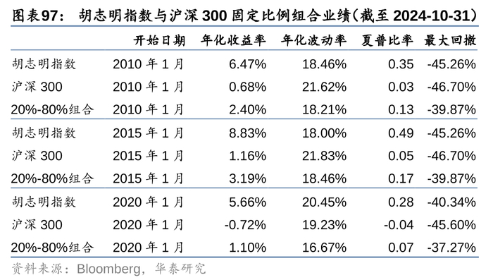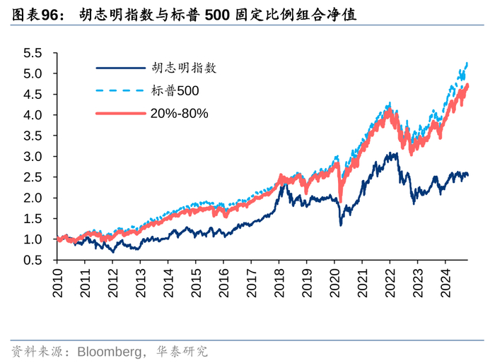 对比全仓配置沪深300,若将20%的仓位分配给胡志明指数,则不同考察区间内,组合的收益、波动和回撤表现都有所改善。在美股上测试结论类似,相比于全仓配置标普500,将20%仓位分配给胡志明指数后,不同考察区间内虽然收益略有下滑,但波动和回撤都有所改善,持有体验的提升也能避免情绪化决策带来的交易磨损。