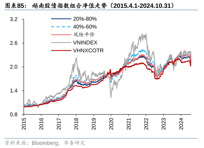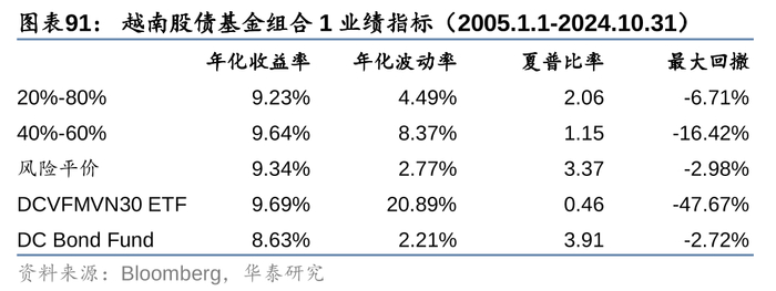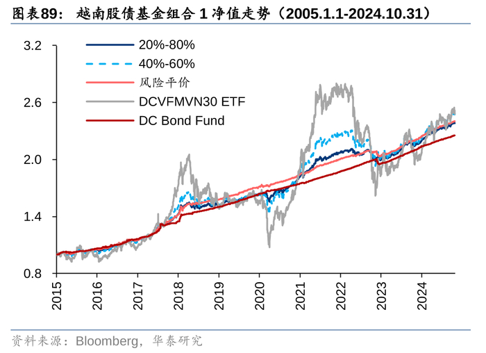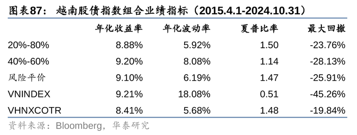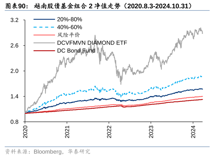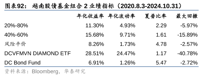 分别采用胡志明指数和越南国债综合财富指数表征股、债资产,2015年4月以来两者年化收益率均在8%以上,据此构建的固定比例股债组合,以及风险平价组合的年化收益率均在9%左右。采用代表性基金也能得到类似的结论,以跟踪VN30指数的DCVFMVN30 ETF为股票资产,以开放式基金DC Bond Fund作为债券资产,构建的固定比例股债组合和风险平价组合2015年以来年化收益率均在9%以上;若将股票基金替换成更受外资青睐的DCVFMVN DIAMOND ETF,则2020年8月以来,固定比例股债组合的年化收益率进一步提升至11%以上。